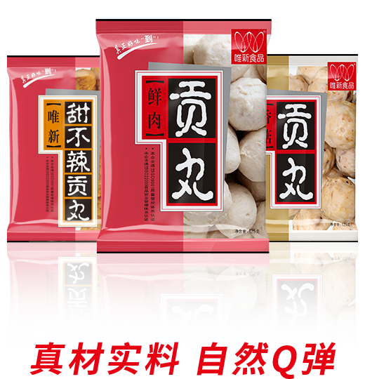 • 選擇蛋白質含量及新鮮度高的豬后腿肉為原料,模擬手工捶打的打漿工藝,再經煮制、冷卻、速凍工藝才可生產出自然脆彈的唯新貢丸,是居家佐餐、火鍋的美味食品。近年來我們還研發生產了香腸、蝦滑、魚丸、牛肉丸等大眾喜愛的家庭火鍋料速凍食品。